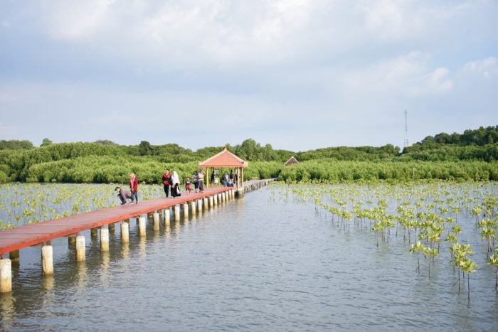 Nah, melalui jembatan ini para pengunjung dapat menyusuri area hutan yang ditumbuhi oleh berbagai pepohonan rindang. Lanskap berupa jembatan merah serta area hutan yang dipenuhi pepohonan mangrove membuatnya cocok dijadikan tempat foto.